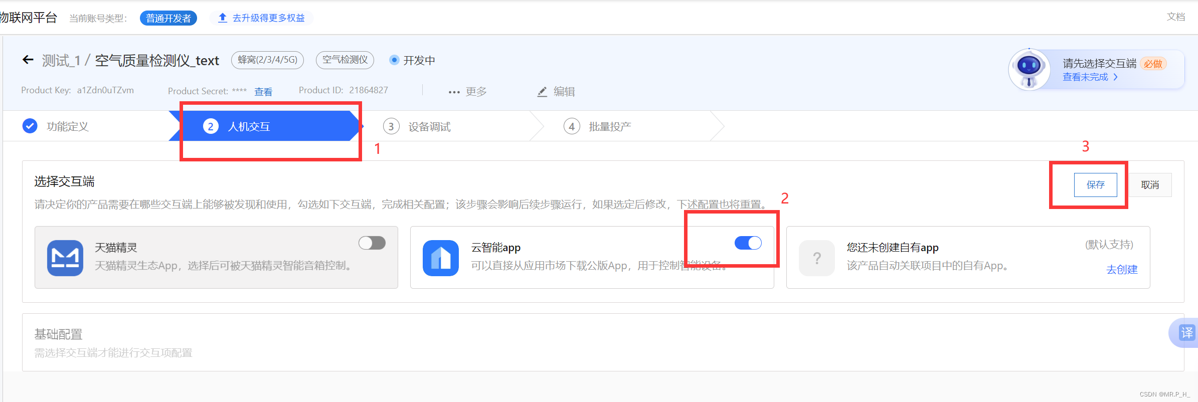 这里回到飞燕平台上,选择设备找到人机交互,选择产品说明书,打开下载配网二维码,手机APP连接即可。