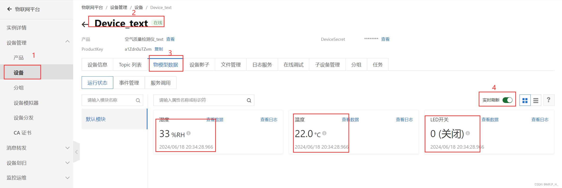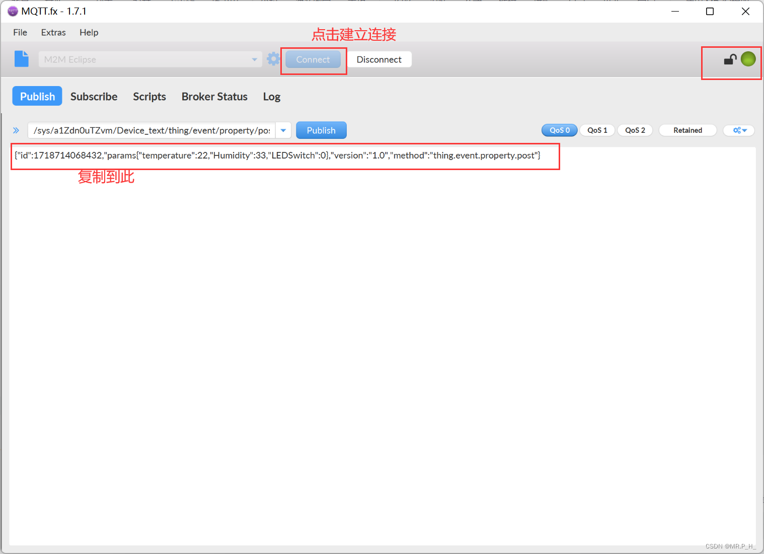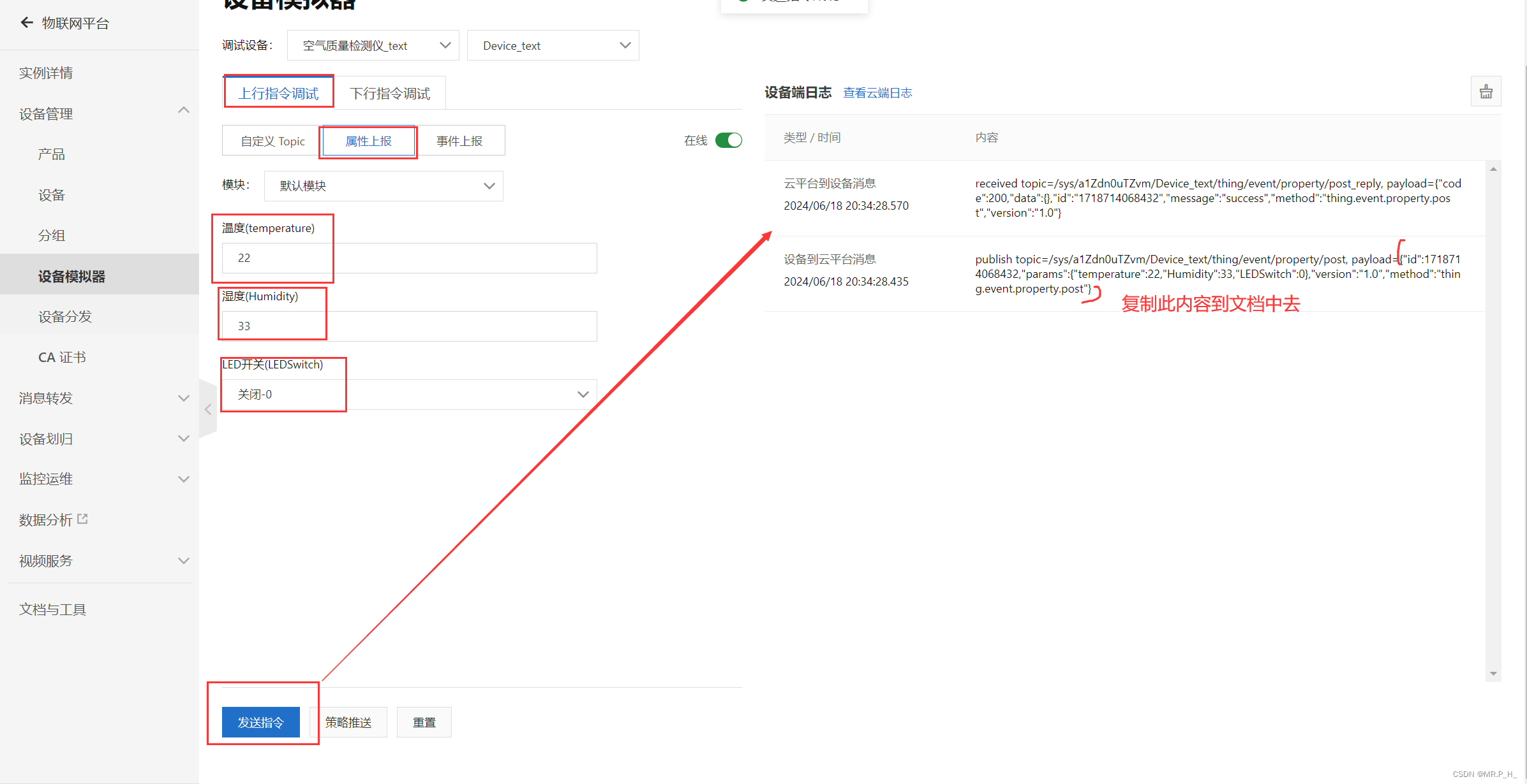对应的内容{"id":1718714068432,"params":{"temperature":22,"Humidity":33,"LEDSwitch":0},"version":"1.0","method":"thing.event.property.post"}