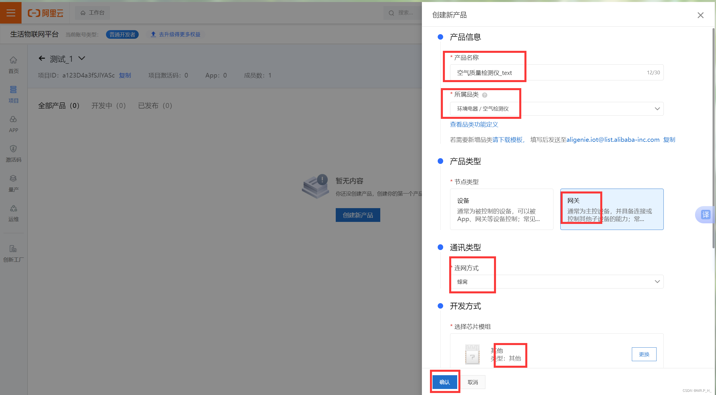点击创建新产品后,输入产品名称;所属品类(自己选择);产品类型选网关;通讯类型选蜂窝;开发方式选择芯片模组选择其他,点击同意,数据格式选择ICA,使用 ID² 认证选择否;点击确认