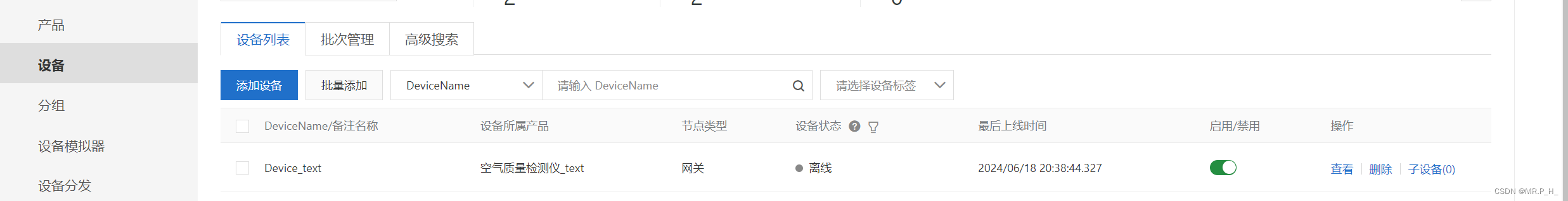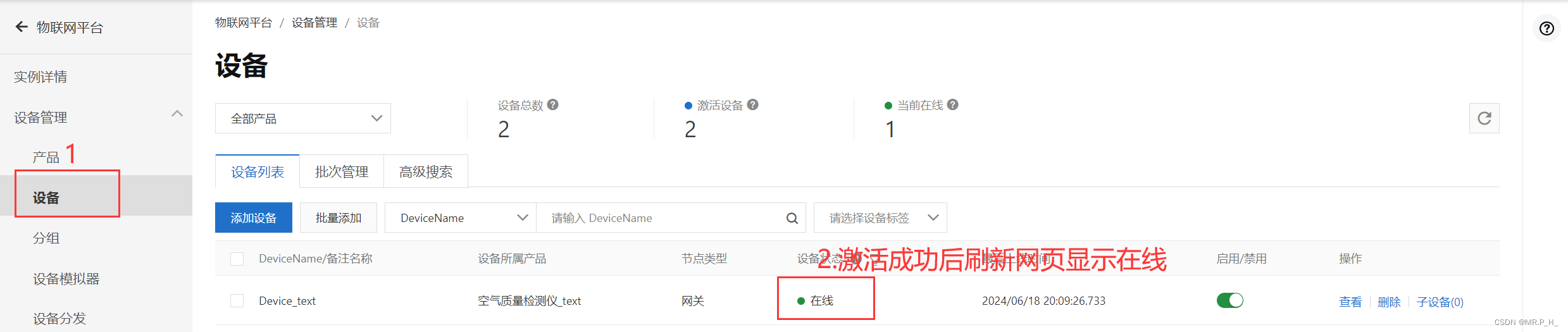返回云平台页面刷新,找到对应设备,显示在线