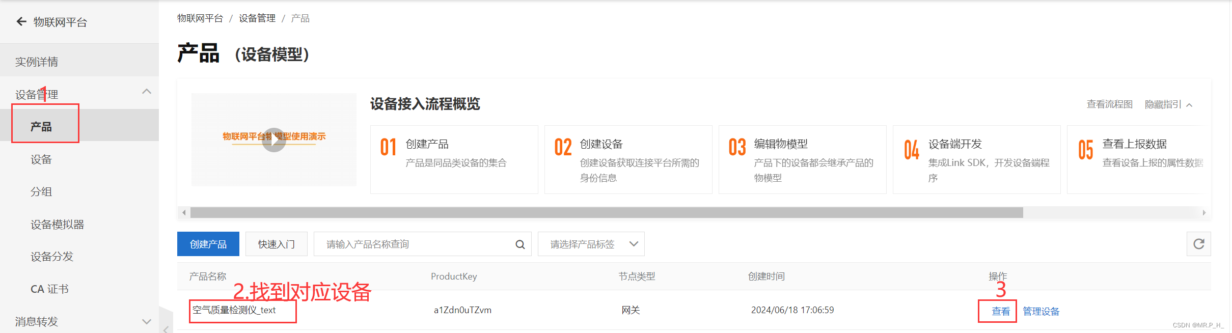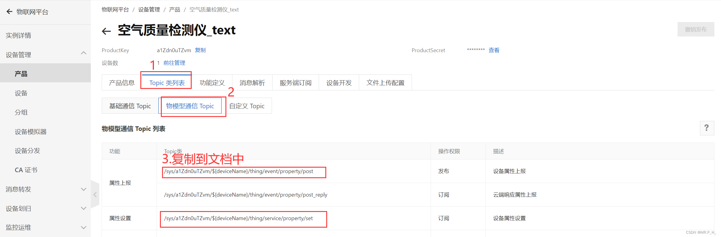 接下来发布消息,点击产品,找到设备,点击查看,找到topic类,再找到物模型通信把对应内容复制下来。