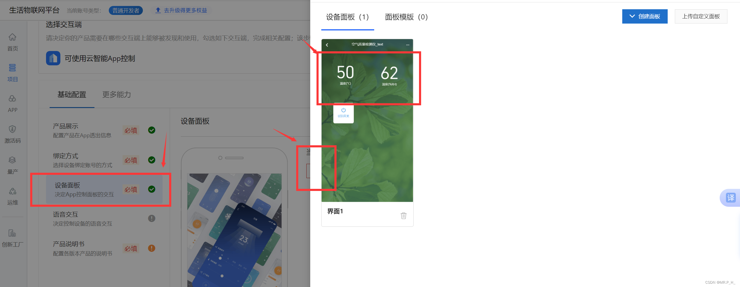保存完成后返回平台,点击设备面板进行配置,点击选择面板,选择刚才创建的面板。