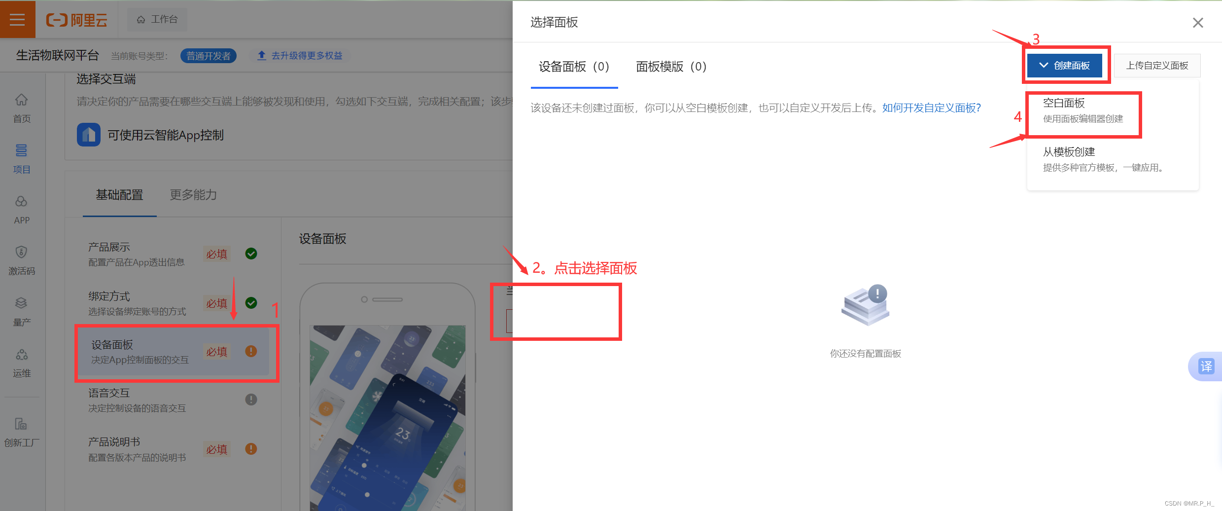 点击设备面板进行配置,点击选择面板,创建面板,空白面板。