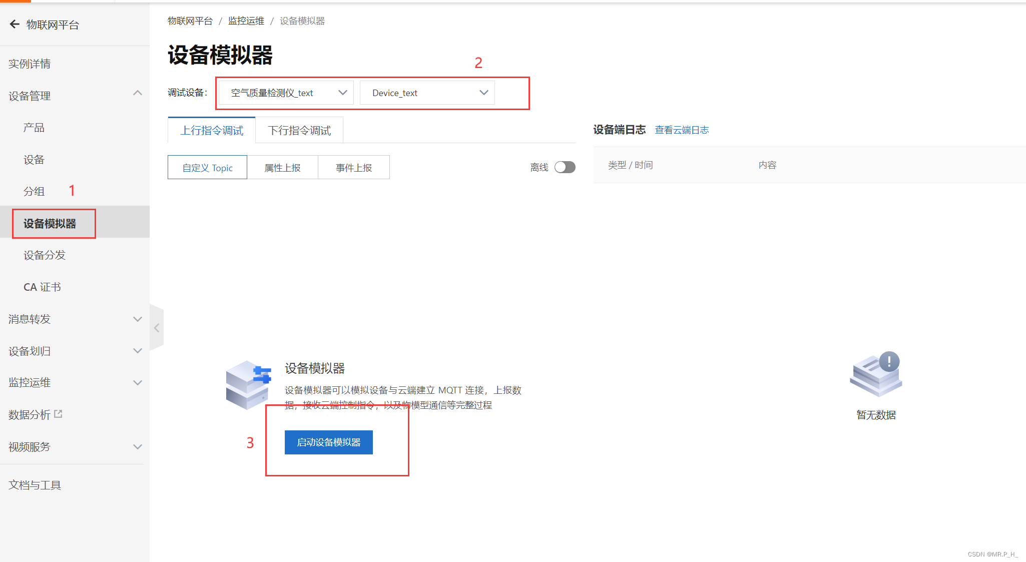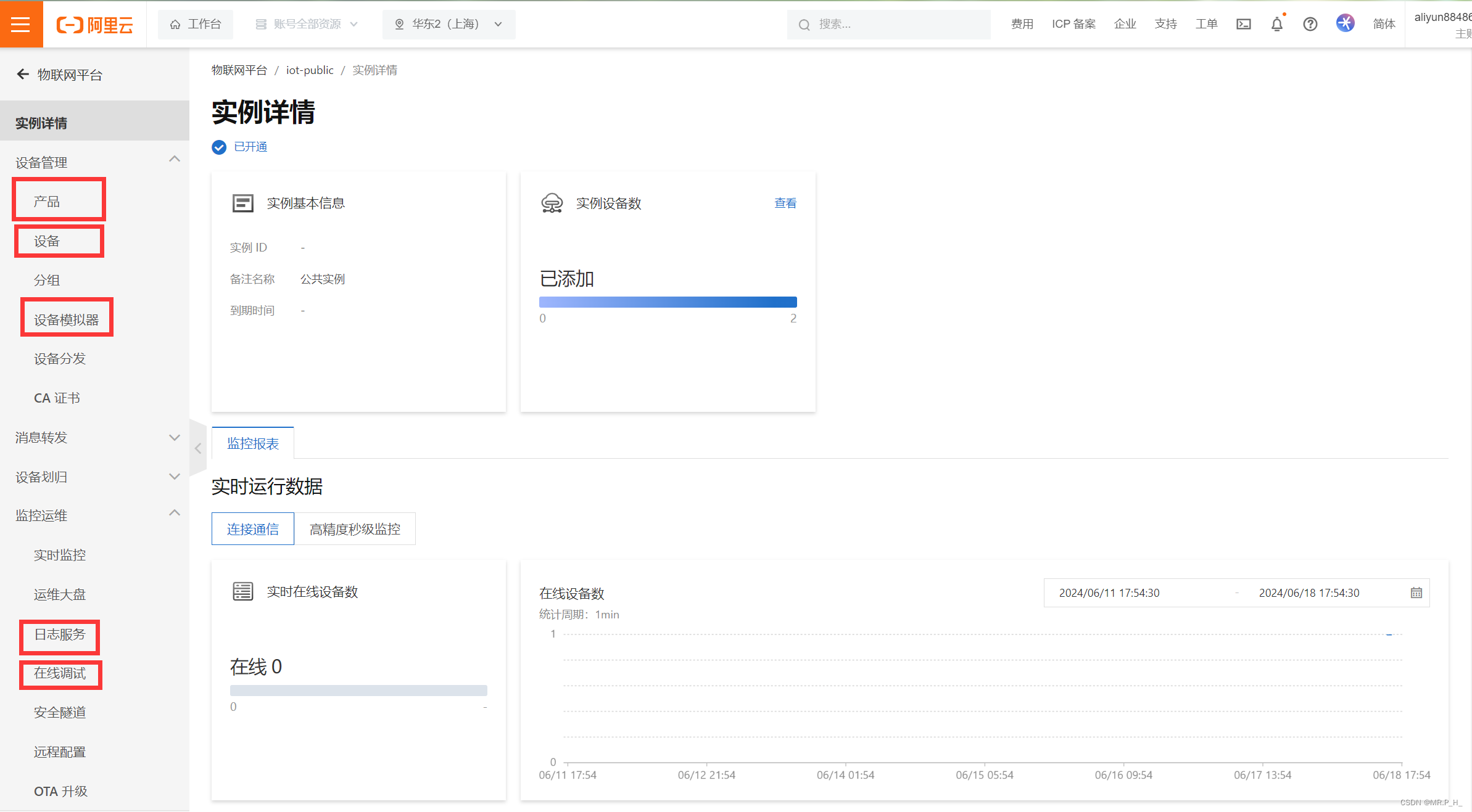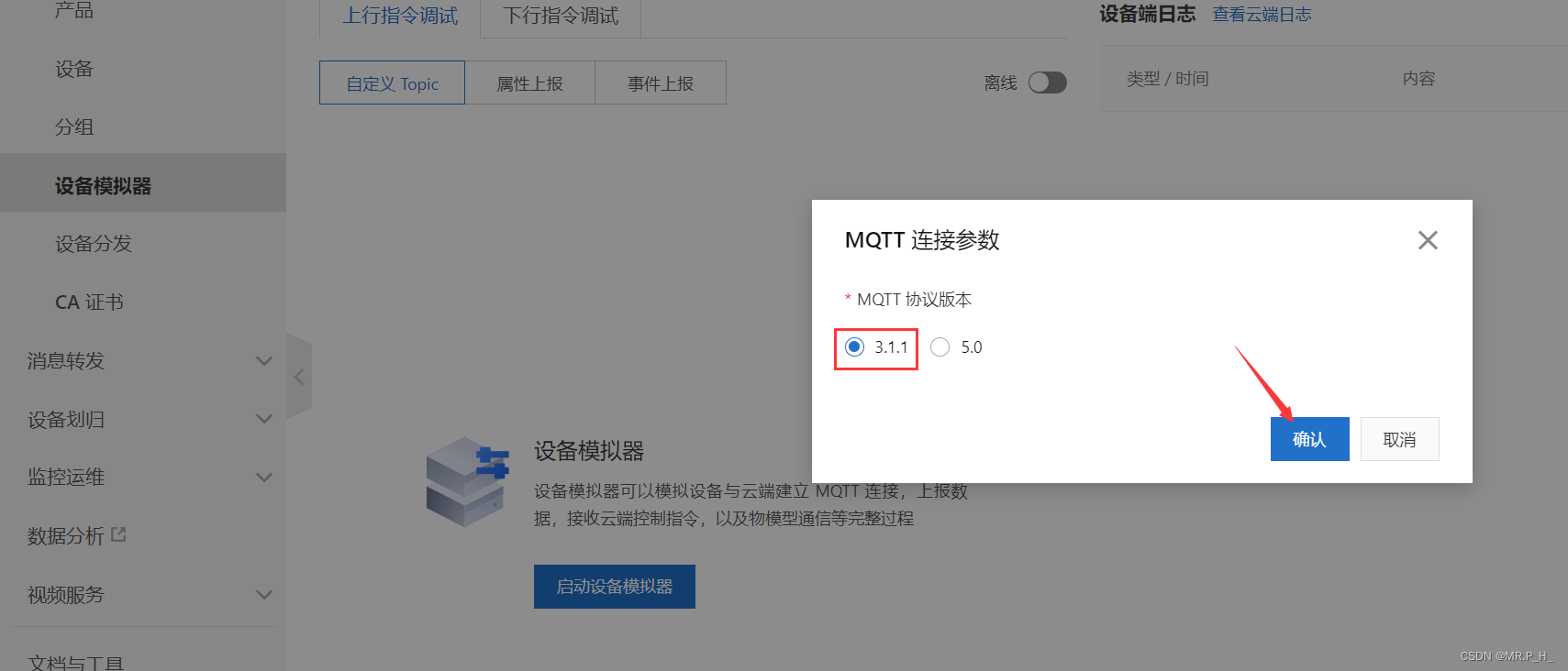 一个产品可以有多个设备,设备模拟器是是模拟单片机(客户端)设备上线,使用的时候要保证单片机设备离线再使用,并且平台显示设备离线。日志服务是显示单片机设备和阿里云通信的数据交互而在线调试是为了下发LED开灯关灯︰阿里云下发指令给单片机。