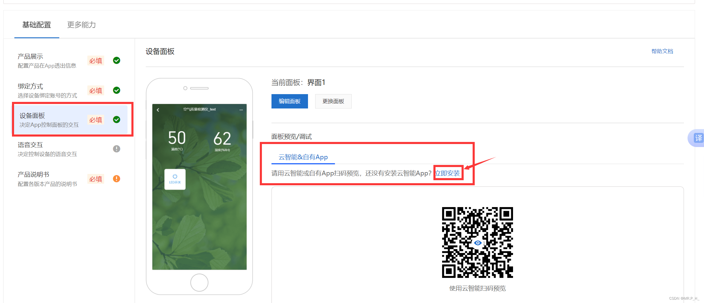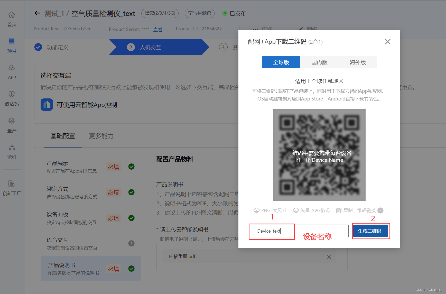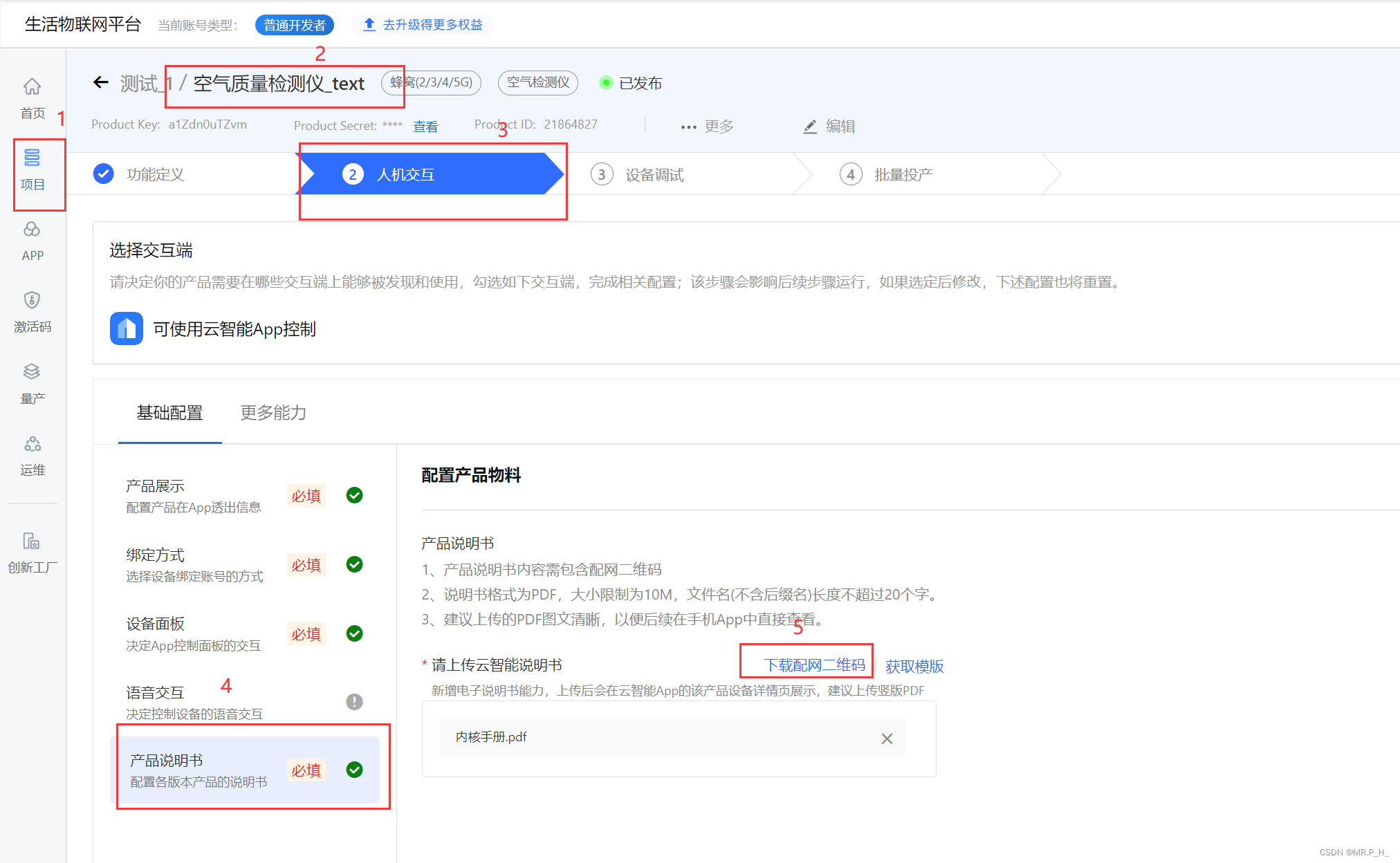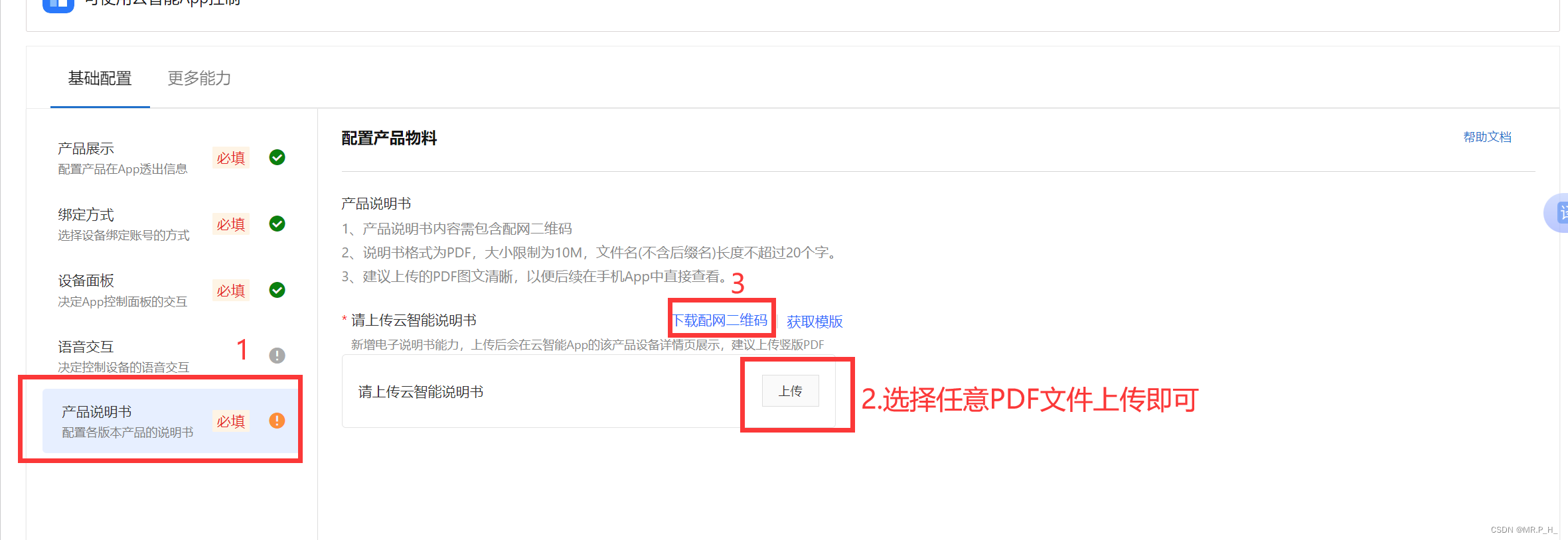 再选择产品说明书,我们是练习所以上传任意PDF文件,然后下载配网二维码,这个二维码用云智能手机APP扫。