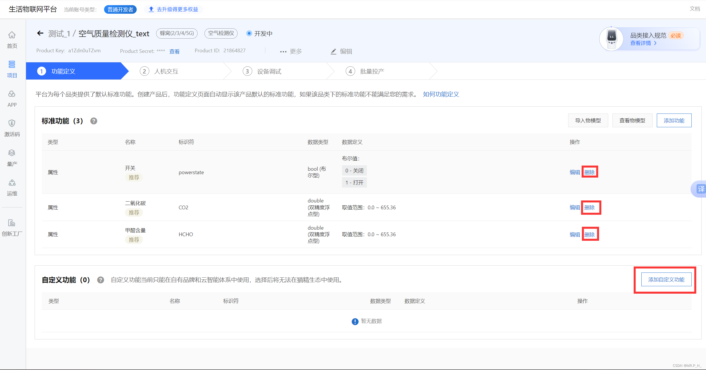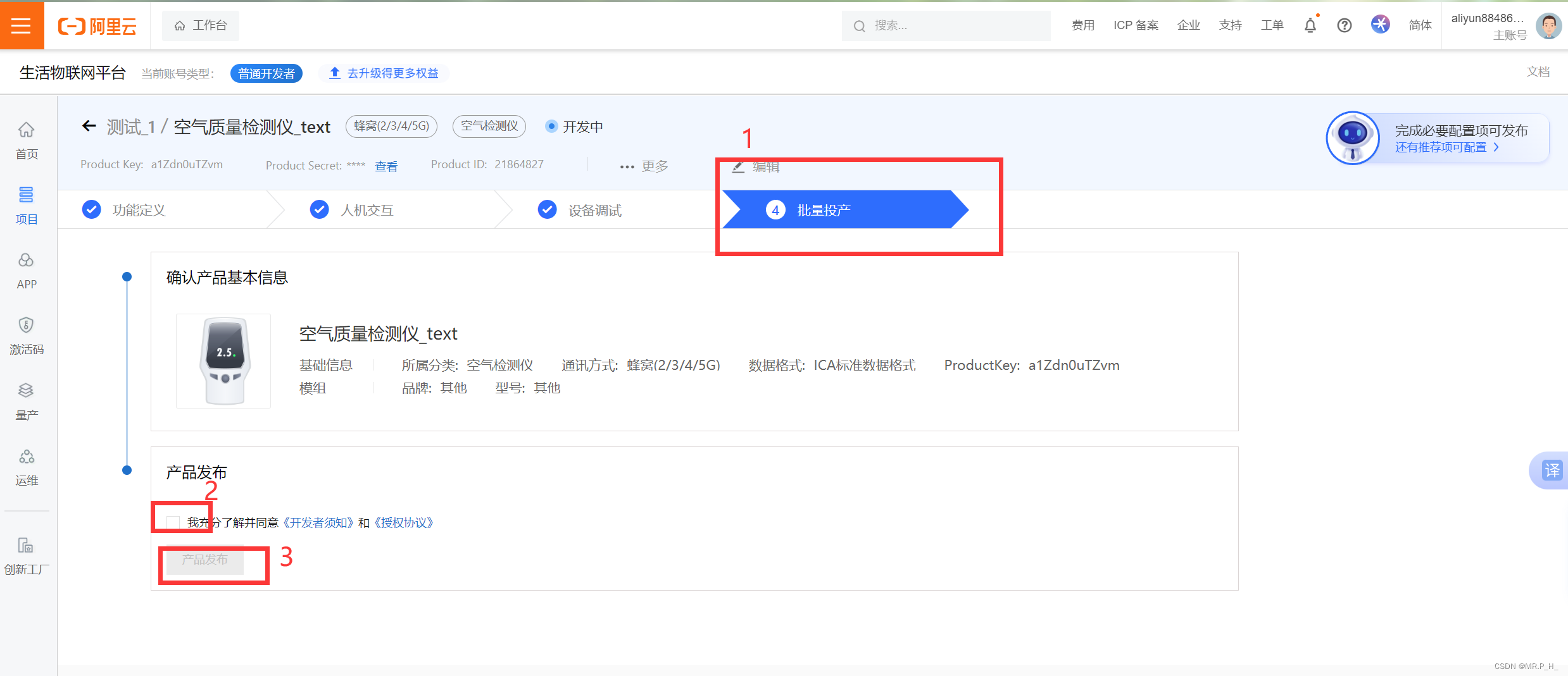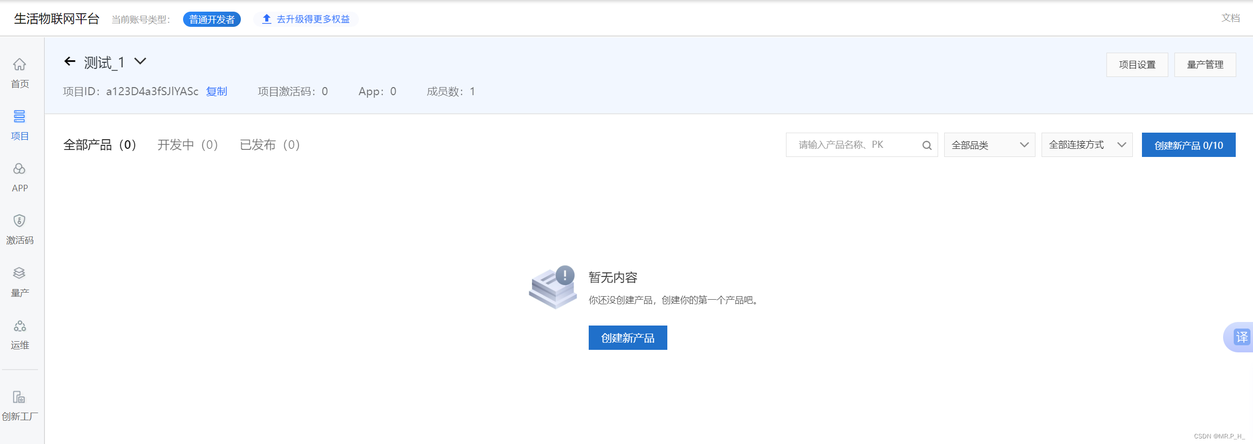 在项目里面创建具体的产品,和物联网平台的产品是一个东西(后续可以在物联网平台中查看到该产品,以及该产品下面的设备)