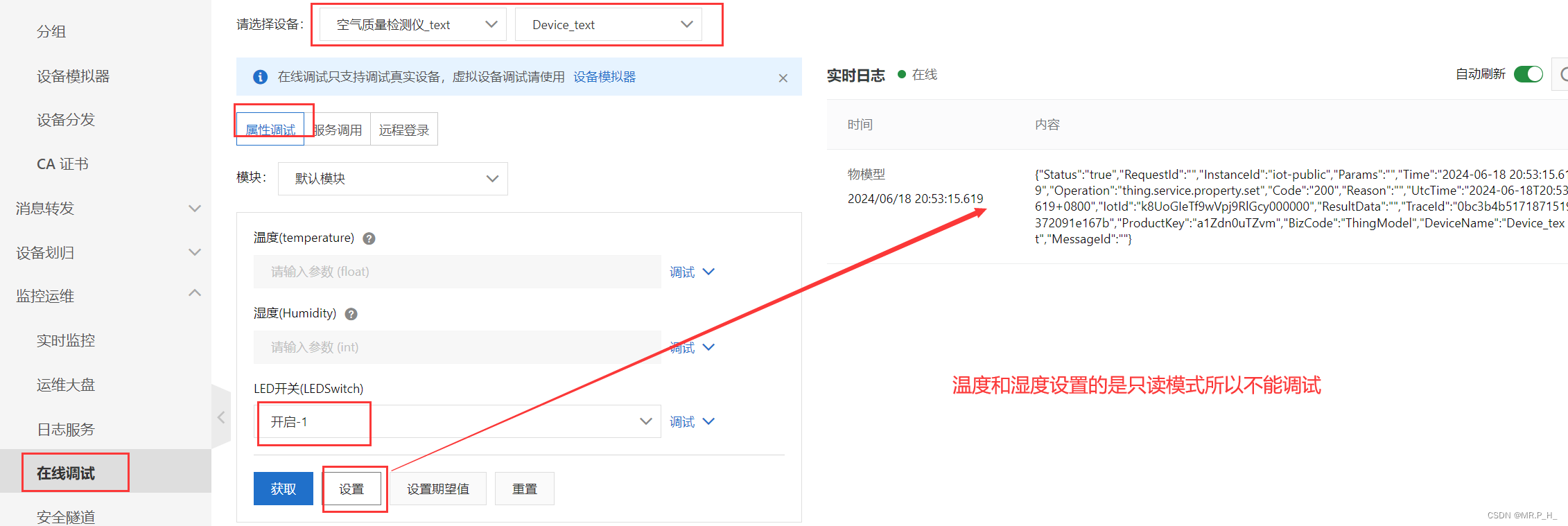 找到在线调试,选择对应设备,调节对应功能模块,点击设置,日志显示则成功