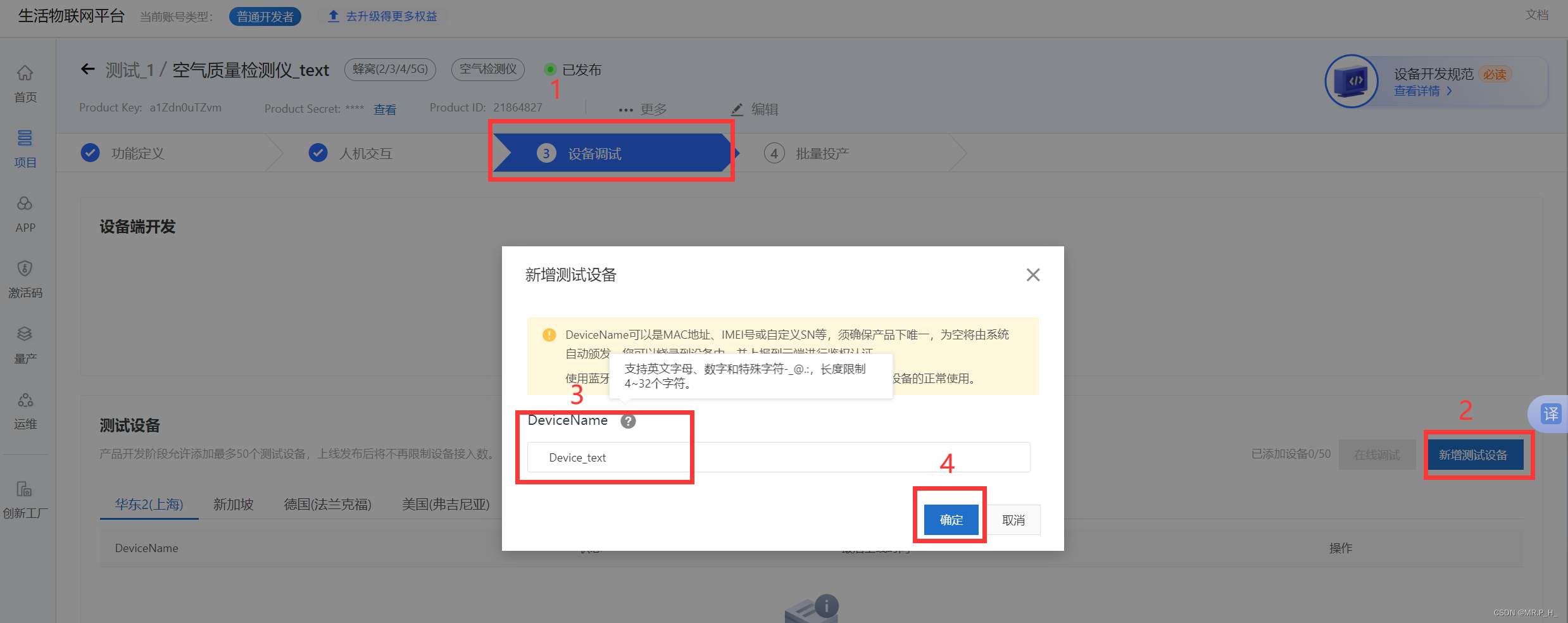 点击设备调试,新增测试准备,输入设备名,点击确定。