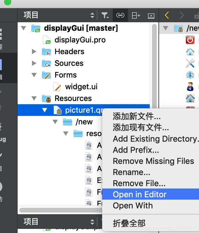 1.在QT创建的工程中,右击鼠标,弹出菜单栏,点击创建新文件2.选择QT,选中QT resoure file ,点击choose3.创建名字4.我这里创建的名字是picture1,点击继续,则出现以下界面,点击完成即可5.创建完成后,则出现如下界面,可看到一个qrc的文件6.右击鼠标,在右键菜单中,选中Open in Editor7.进入编辑界面,可...
