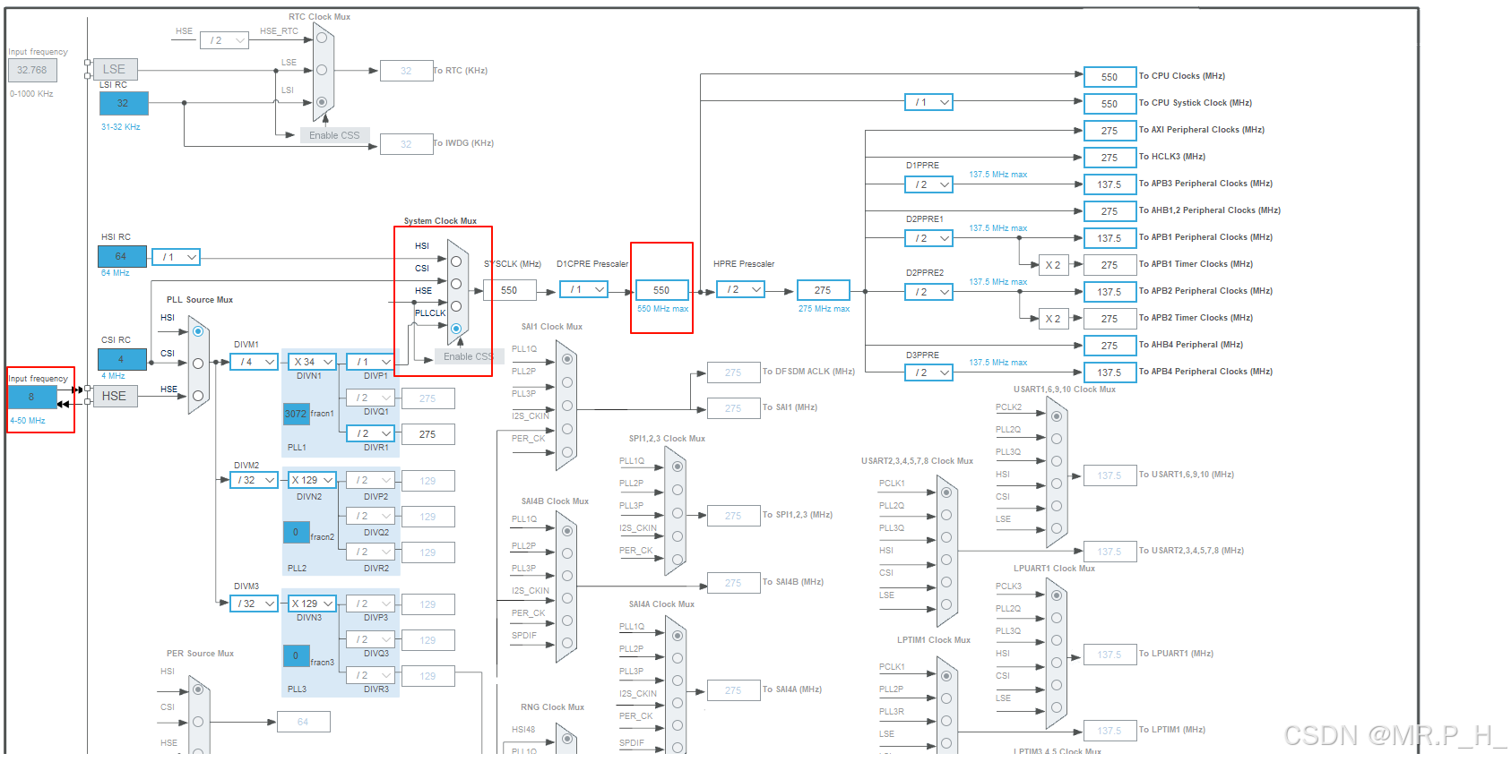 值得注意的是STM32H723的主频为550MHZ,定时器最大频率为275MHZ,我使用的是外部8MHZ的晶振进行倍频!输入550后软件会自动匹配!
