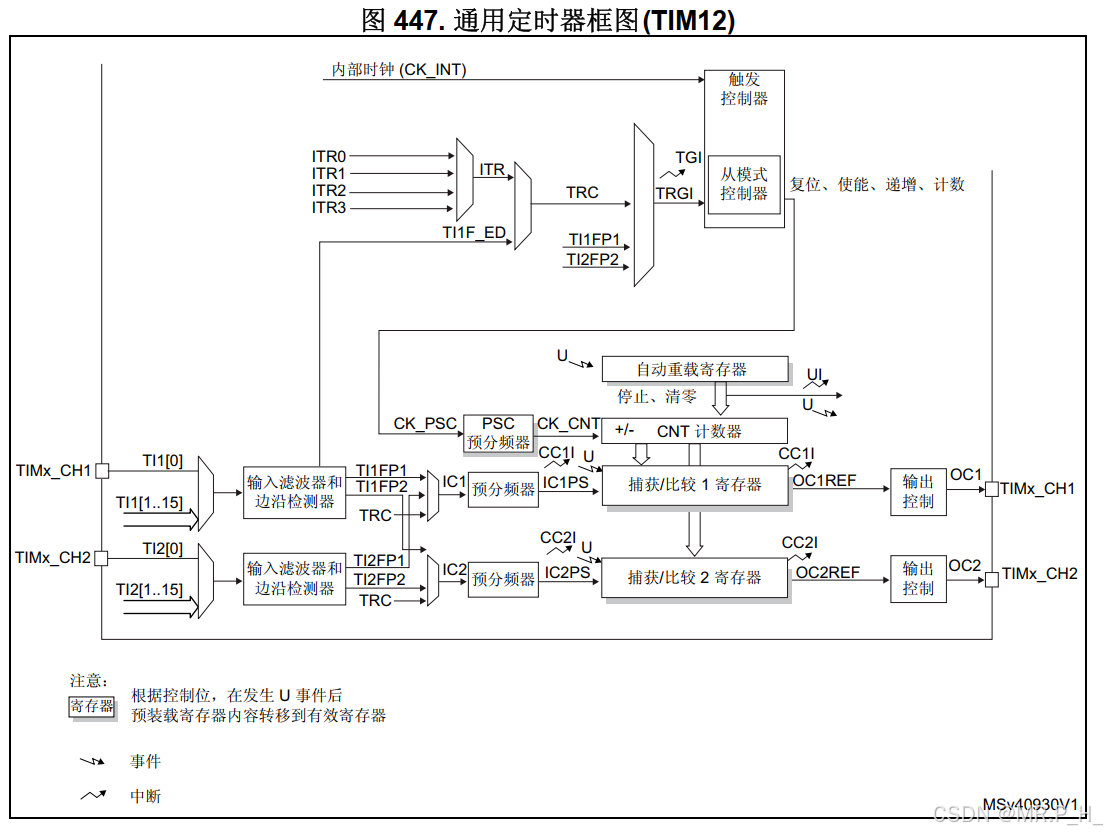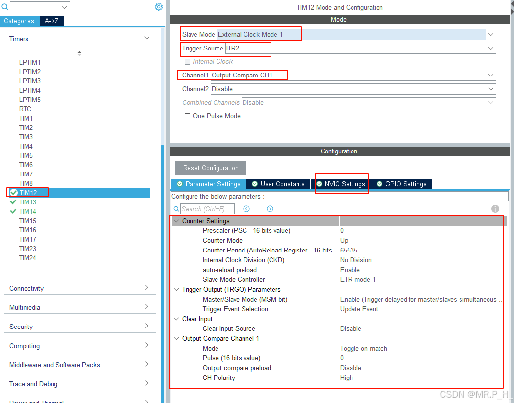 可以看到TIM12作为TIM13的从定时器,内部触发选择ITR2,原理和上文的F407相似,不在过多解释!