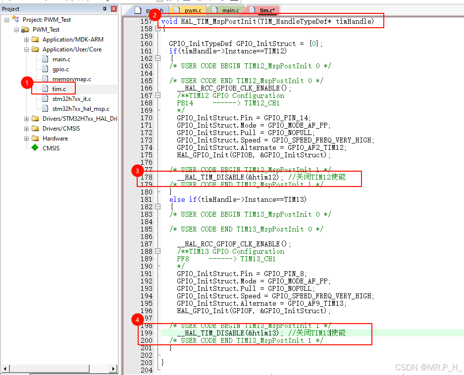 修改代码,将定时器tim.c中的初始化HAL_TIM_MspPostInit中添加__HAL_TIM_DISABLE()函数先关闭使能!