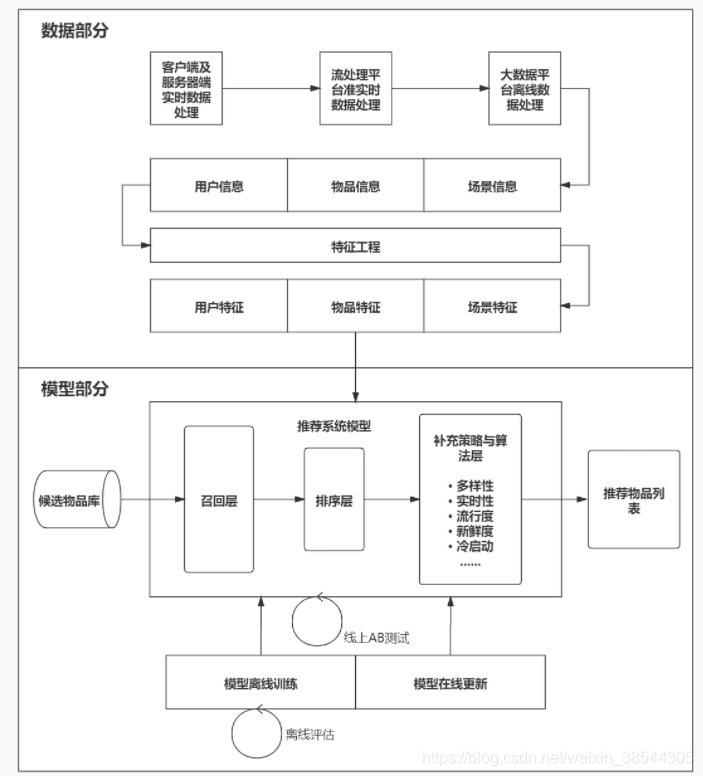 推荐系统的具体实现可以分为数据和模型两个部分。其中数据部分主要负责“用户”“物品”“场景”的信息收集与处理。具体讲,将负责数据收集与处理的三种平台按照实时性强弱排序,依次为“客户端及其服务器端实时数据处理”“流处理平台准实时数据处理”“大数据平台离线数据处理”。在实时性由若到强递减的同时,三种平台的海量数据处理能力则由弱到强。