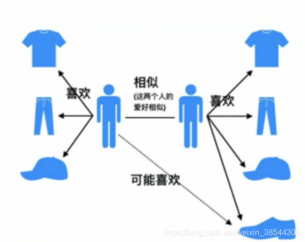 基于用户相似度的协同过滤核心思想认为:兴趣相同的人,喜欢的东西也类似。如下图所示: