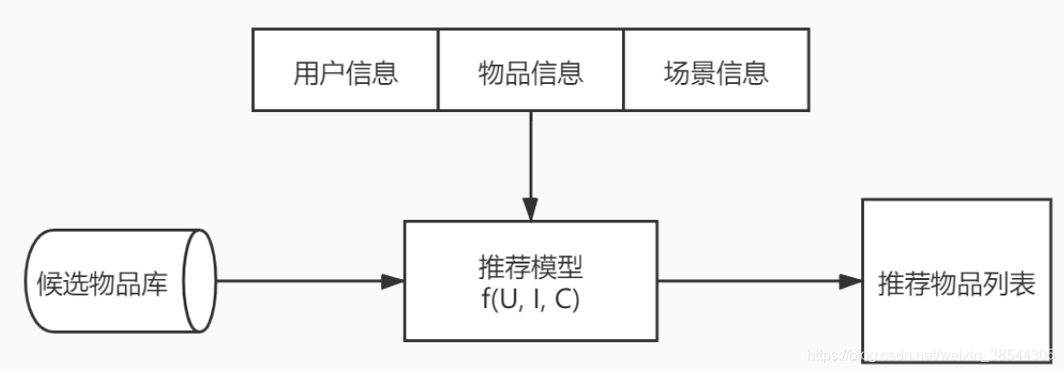 在获知“用户信息”“物品信息”“场景信息”的基础上,推荐系统要处理的问题可以较形式地定义为:对于用户U,在特定场景C下,针对海量的“物品”信息,构建一个函数f(U,I,C),预测用户对特定候选物品I的喜好程度。其逻辑框架如下:
