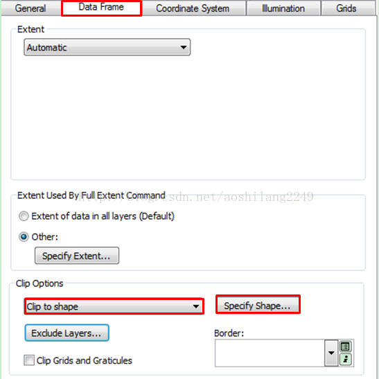 选择该结果图层所属的图层集,右击选择“Properties”,在弹出的图层属性对话框中,选择“DataFrame”范围标签,设置裁剪的范围为指定的范围: