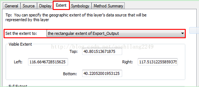 选择该图层,右击选择“Properties”,在弹出的图层属性对话框中,选择“Extent”范围标签,设置图层的范围为指定图层的范围(即红色线图层的范围,该图层的名称为Export_OutPut):