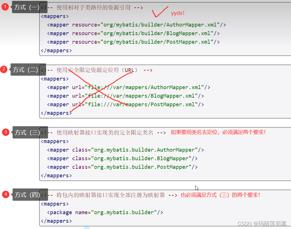 <mappers>映射器标签,有4种定义方式,以后一律用第1种。