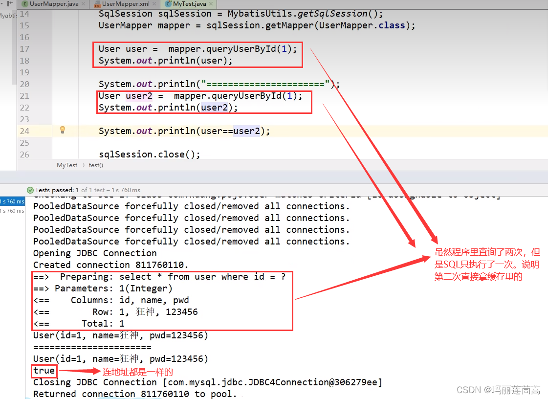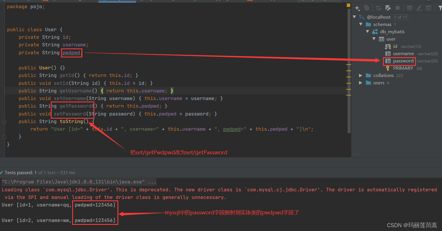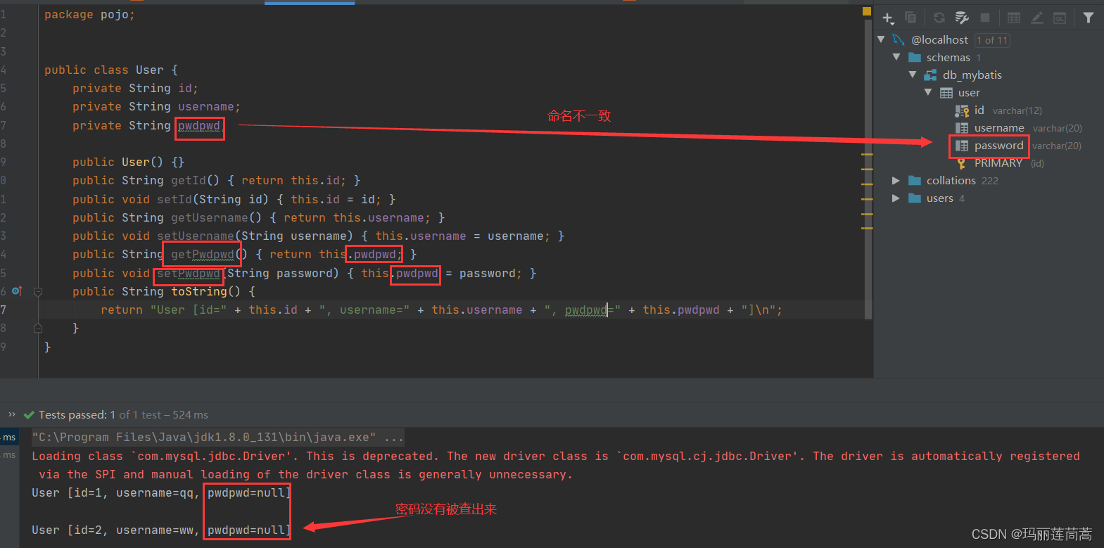 比如,当我们将实体类User的密码属性从“passWord”改为“pwdpwd”,而数据库中的字段仍然是password时,密码会被mysql查出来,但是映射不到java对象当中去,所以程序产出的结果是null。