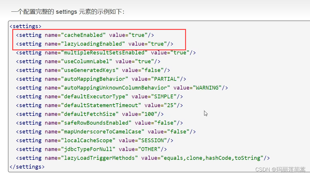 <settiings>标签极为重要,因为会改变mybatis的运行时行为。下面框出来的两个是最常用的设置。除此之外,还有日志工厂的设置,下面会单独拿出来讲。