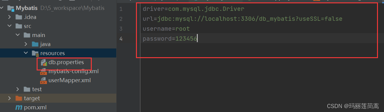 这样,如果数据库的信息需要更改,我们只需要更改db.properties文件就可以了,和mybatis毫无关系。