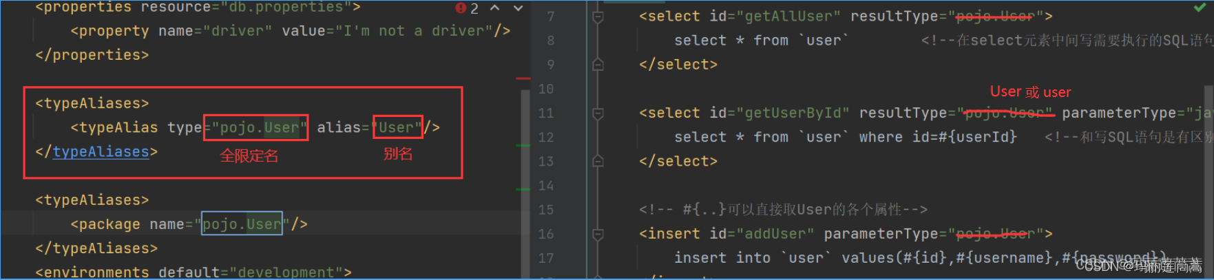 <typeAliases>起别名:之前我们在Mapper.xml里指定resultType和parameterType时,一直用的全限定名,有多个SQL语句就要重写多次全限定名,别名的作用就在于简化全限定名,意义仅在于让我们少打几个字,看着舒服些。有两种起别名的方式: