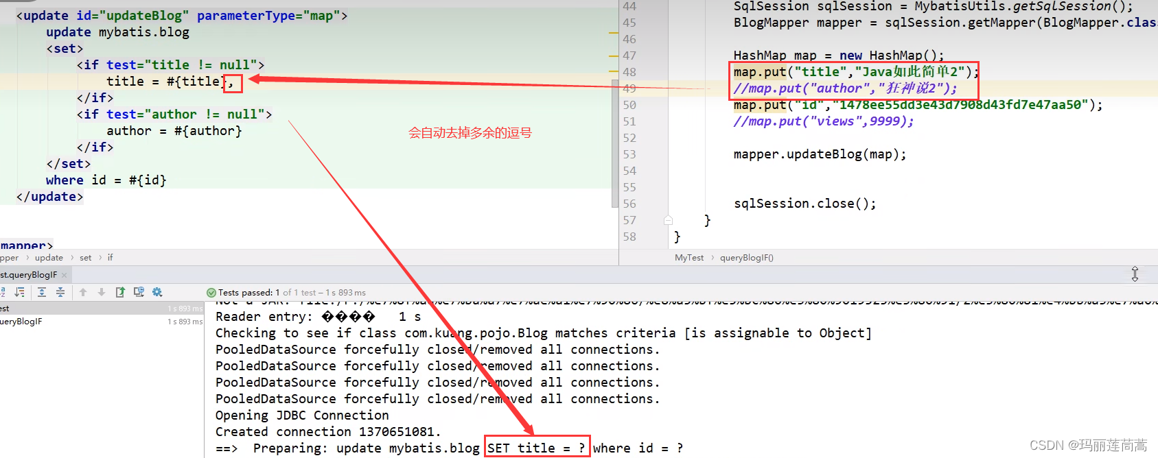 作用:同<where>标签。<set>标签用于update语句,会自动加上set关键字,并且会自动删去无关的逗号