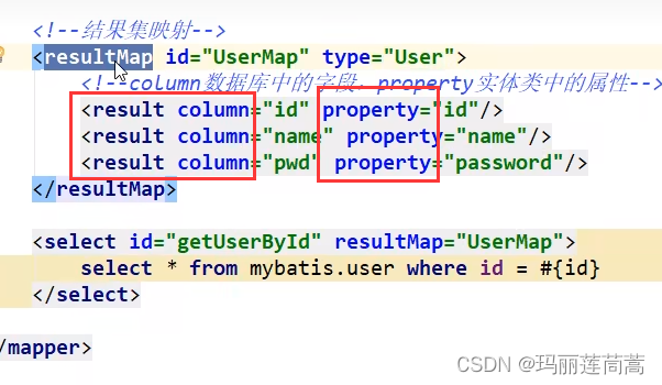 <result column="password" property="pwdpwd"/> <!--column是数据库的字段,property是实体类的属性-->