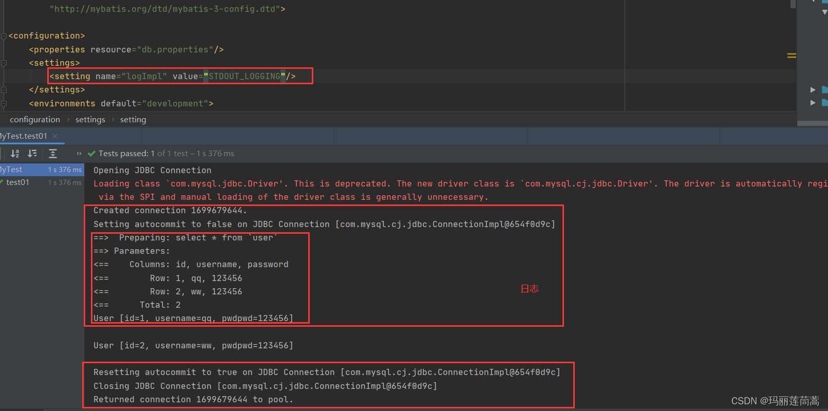 当然,我们也可以在<properties>标签里配置属性,但是不推荐这样。当同时在db.properties文件和<properties>标签里配置了相同的属性时,优先使用.properties文件里的。如下图所示,虽然我们在<properties>标签里配置了driver的属性,但是生效的依然是db.properties文件里的配置。