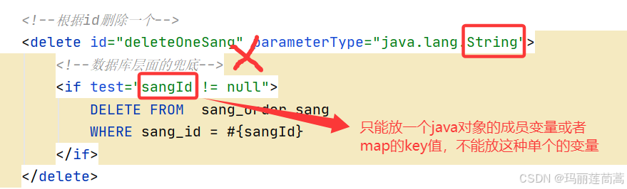 (2)test条件里只能放多值变量。当传来的参数只是一个String时,不能作为<if test>的条件,会报“no getter for property named 'sangId'”,如下图