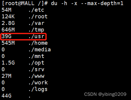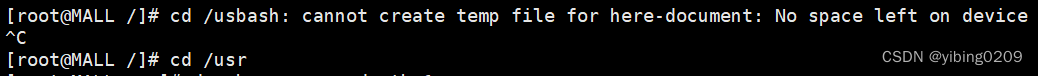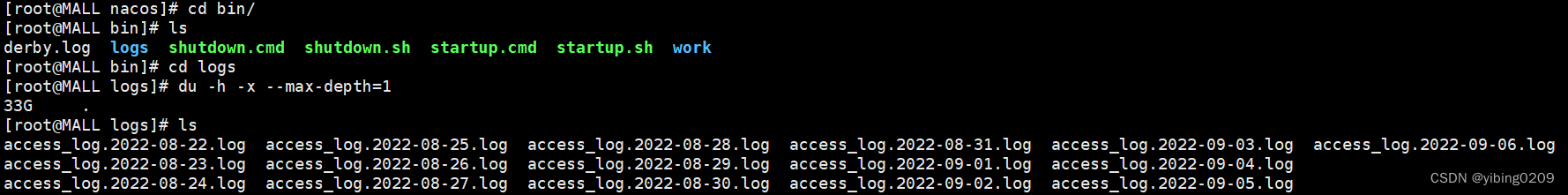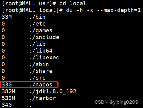 三、这时候空间满了想使用tab补全发现已经用不了了。四、cd 到 usr 后发现 local 占用 34G。六、发现是 log 里面每天备份的日志文件占用了很大内存。八、删除完后发现已经释放了一部分空间。九、再把剩下的日志文件全部删除。发现 usr 占用了39G。七、删除掉一部分日志文件。五、cdnacos。十、空间释放完成,搞定。