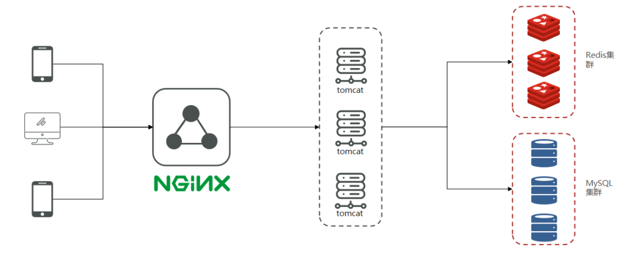 在tomcat支撑起并发流量后,我们如果让tomcat直接去访问Mysql,根据经验Mysql企业级服务器只要上点并发,一般是16或32 核心cpu,32 或64G内存,像企业级mysql加上固态硬盘能够支撑的并发,大概就是4000起~7000左右,上万并发, 瞬间就会让Mysql服务器的cpu,硬盘全部打满,容易崩溃,所以我们在高并发场景下,会选择使用mysql集群(面试准备),同时为了进一步降低Mysql的压力,同时增加访问的性能,我们也会加入Redis,同时使用Redis集群(面试准备)使得Redis对外提供更好的服务。