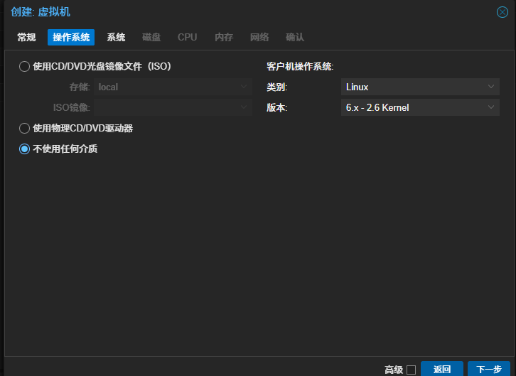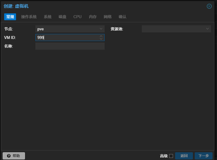 创建个空白虚拟机 记住第1步里面的VM ID,第2步操作系统和第4步磁盘不需要选择,最后一步完成。
