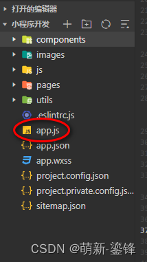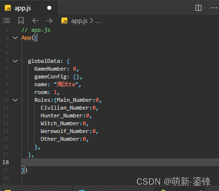 app.js中主程序为app{()},搭建对象globalData{},内部存储全局变量,按照正常变量定义方式进行定义,如图所示