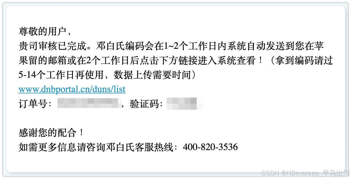 若申请超过两周仍无进展,可主动向 D&B 发送邮件查询进度。[邮件联系入口](opens new window)。