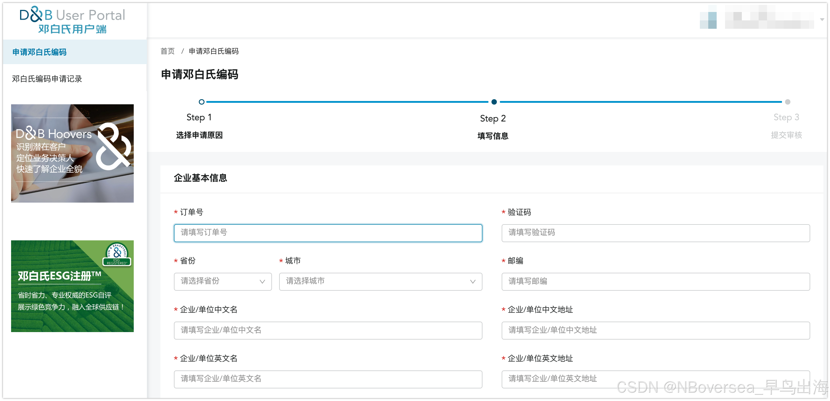 订单号与验证码可在邓白氏的邮件中找到,填入后提交申请。若遇到不清楚的内容或缺少资料,可联系公司行政人员协助处理。