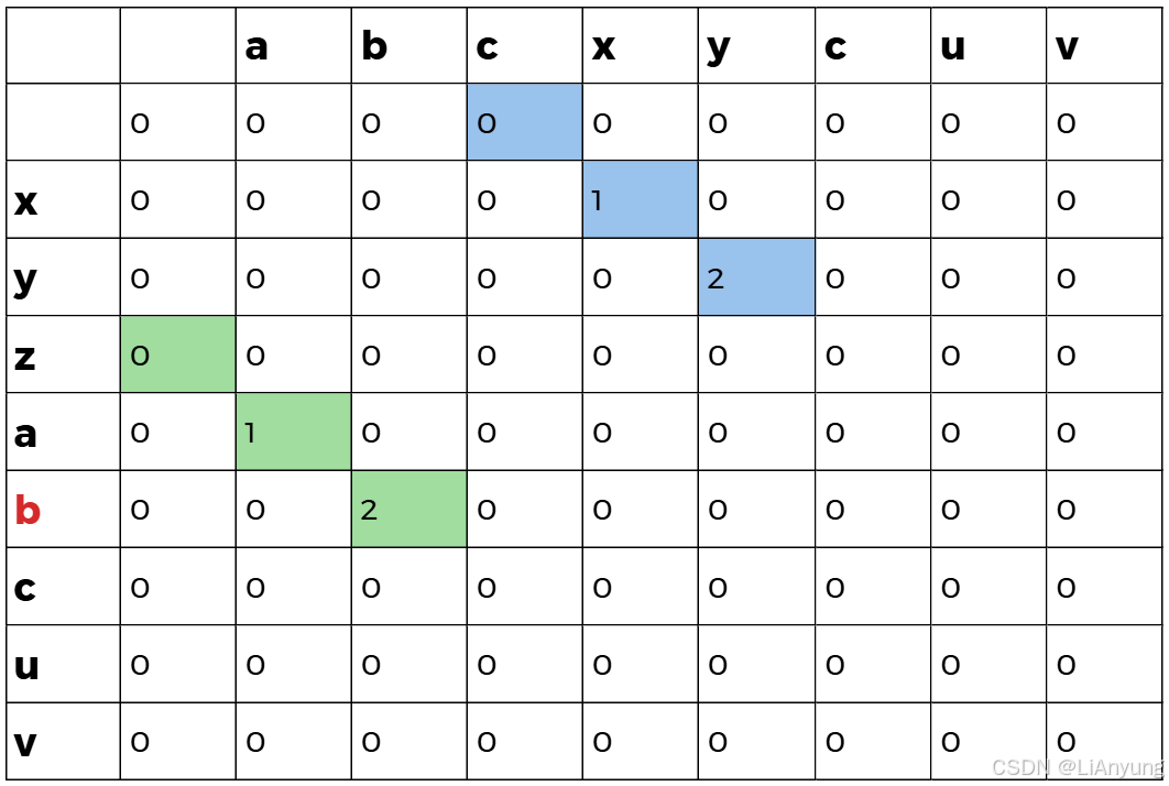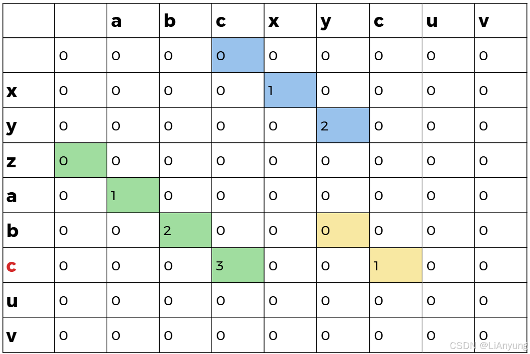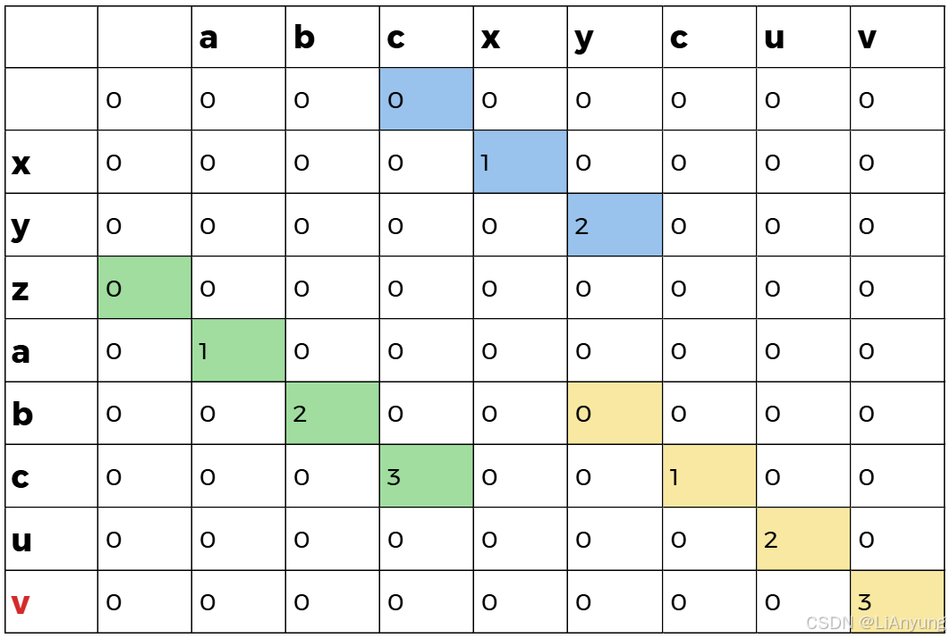 最后A字符串中的 'v' 遍历结束,整个dp数组中最大为3,表示最长公共子串长度为3,最终得到的最长公共子串为 'abc' 和 'cuv'。