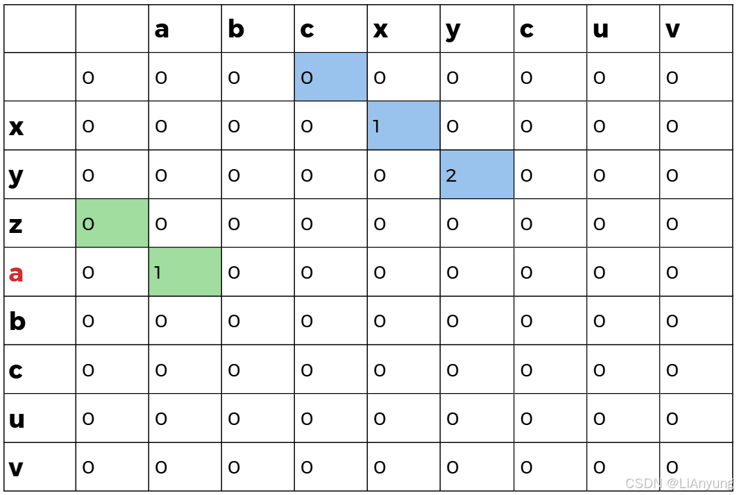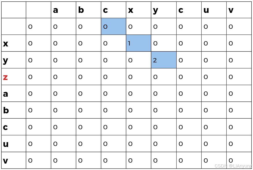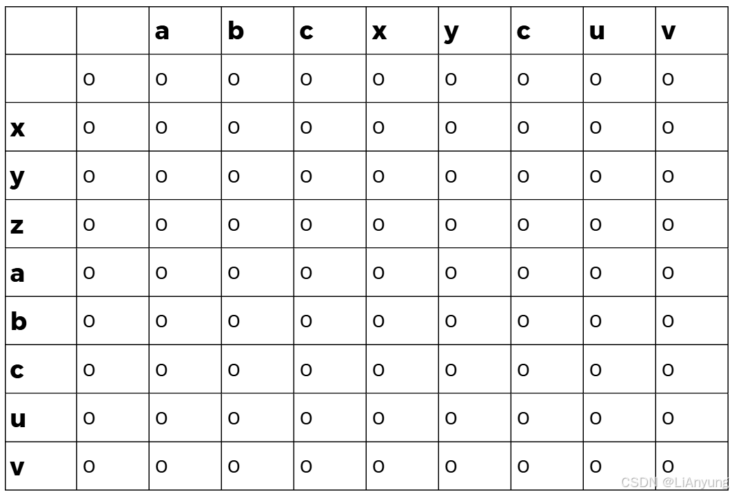 假设现在有两个字符串A = "xyzabcuv"和B = "abcxycuv",初始化9x9全为0的dp数组,如下图所示: