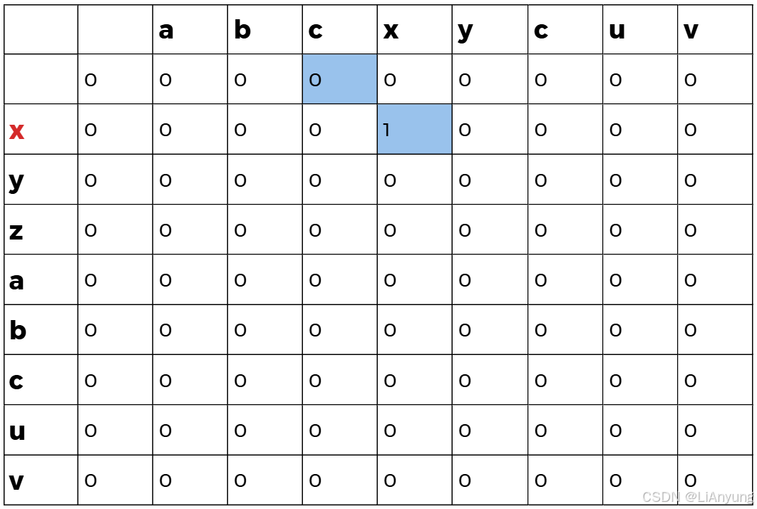 将A字符串的首个字符 'x' 依次与B字符串的每个字符比较,如果相同,令dp[1][j] = dp[0][j] + 1,即将左上角中的值加一填入当前位置;如果不同,dp[1][j] = 0,即当前位置为0 。