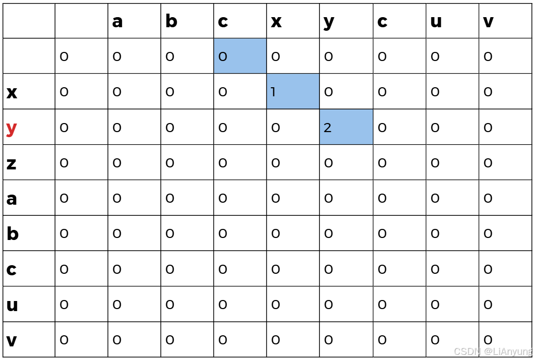 同样的,将第二个字符 'y' 与B中的每个字符比较,'y' 与B中第五个字符相同,取左上值1加上1得2,填入2。第二轮遍历后得到如下图表: