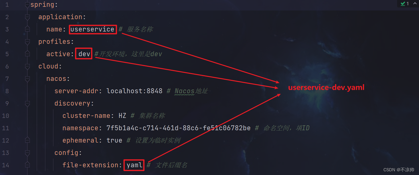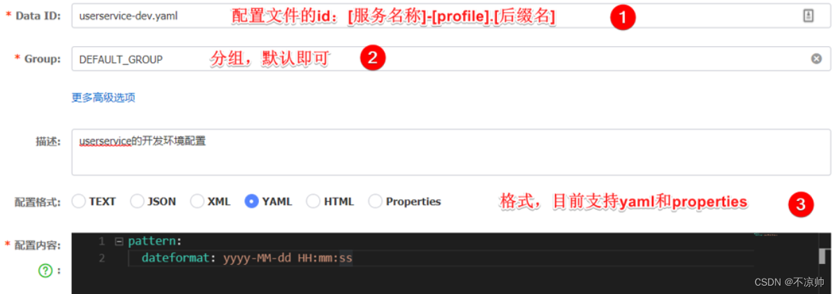 [spring.application.name]-[spring.profiles.active].yaml,例如:userservice-dev.yaml -