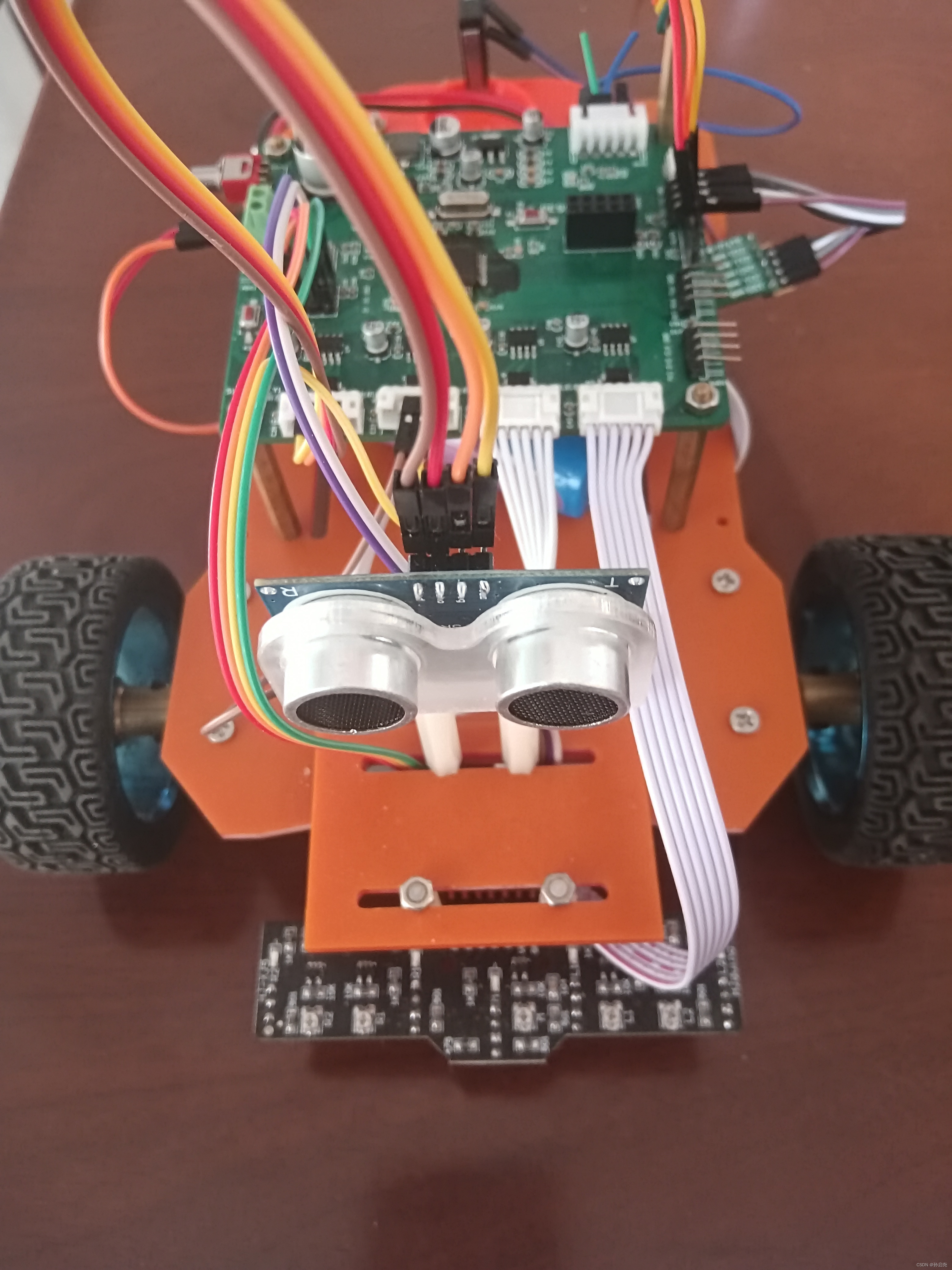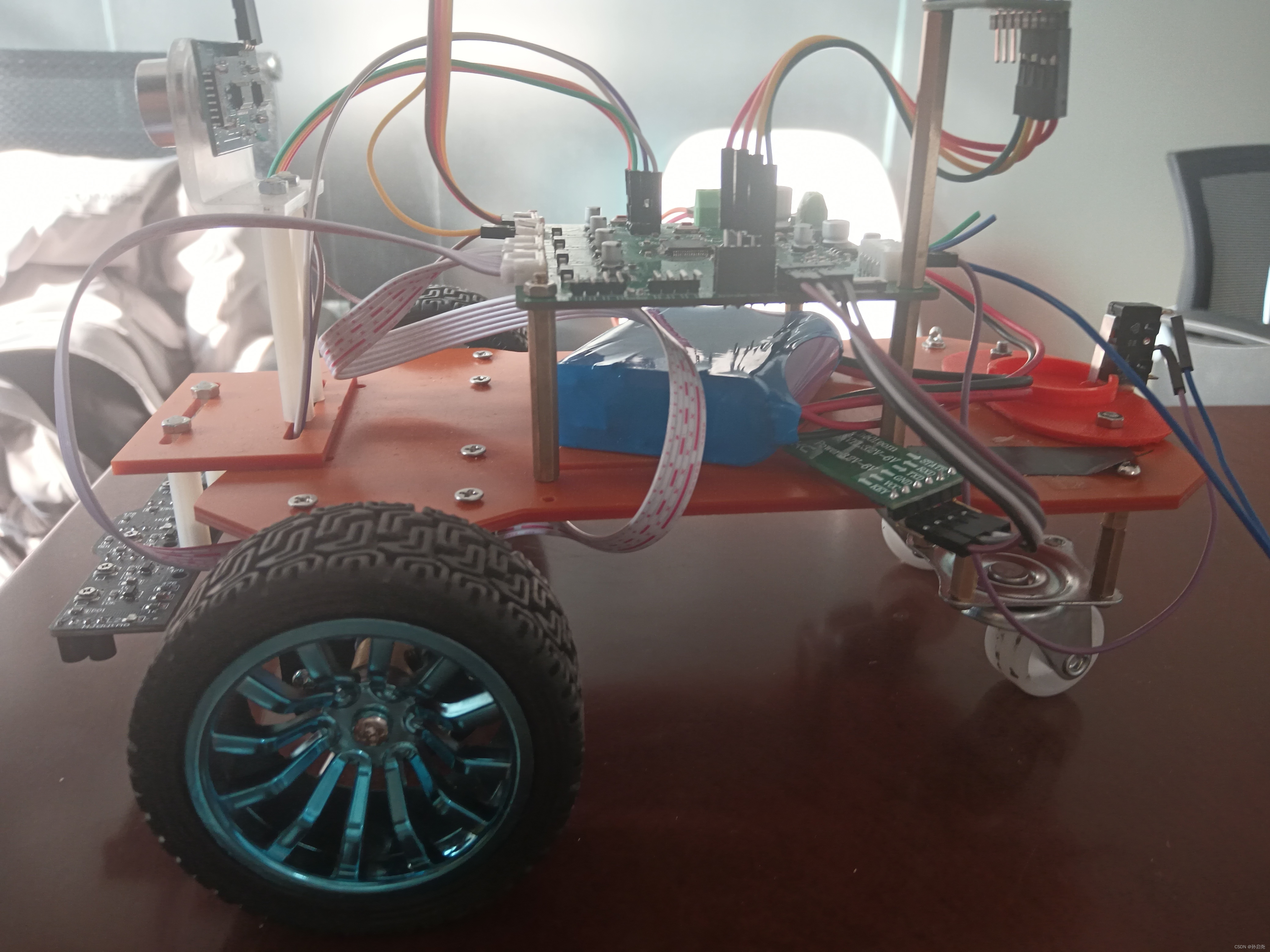 在前两周的时间里,我对上个版本的小车进行了一个更新换代,将原本的4驱小车换成了4轮两驱小车,舍弃了树莓派4B作为上位机。新版小车采用两个520直流减速电机搭配AS4950电机芯片来差速行进,后面采用两个万向轮带着,5路灰度传感器循迹,用HC_SR04超声波模块中断式测距,用HC_08蓝牙模块与手机进行通信,同时搭载MPU6050模块来拐直角弯。