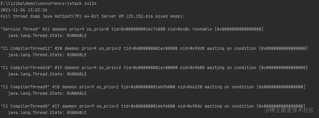 查看某个Java进程的线程状态,可以结合jps一起使用,先通过jps查询进程的id,然后通过jstack查询进程中的所有线程的状态,需要注意的是jstack查询的线程状态,是该进程在查询时刻的线程状态(瞬时态)