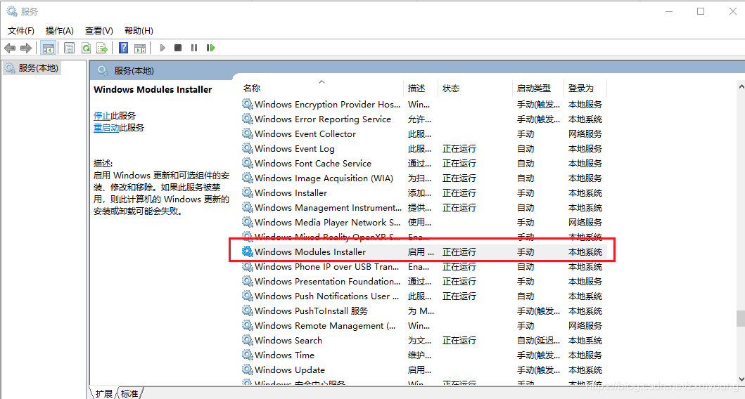 我们在服务(本地)窗口找到:Windows Modules Installer服务,查看是否被禁用;