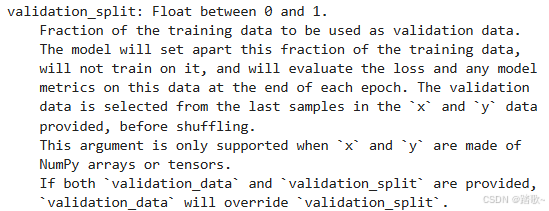 这个方法一般是keras的内置方法,不需要自己编写代码。常见的方式是在fit时设置validation_split或者validation_data参数。两者的区别如下: