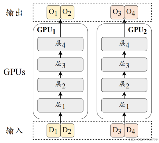 流水线并行-->>侧重于将模型的不同层分配到不同的GPU上。
