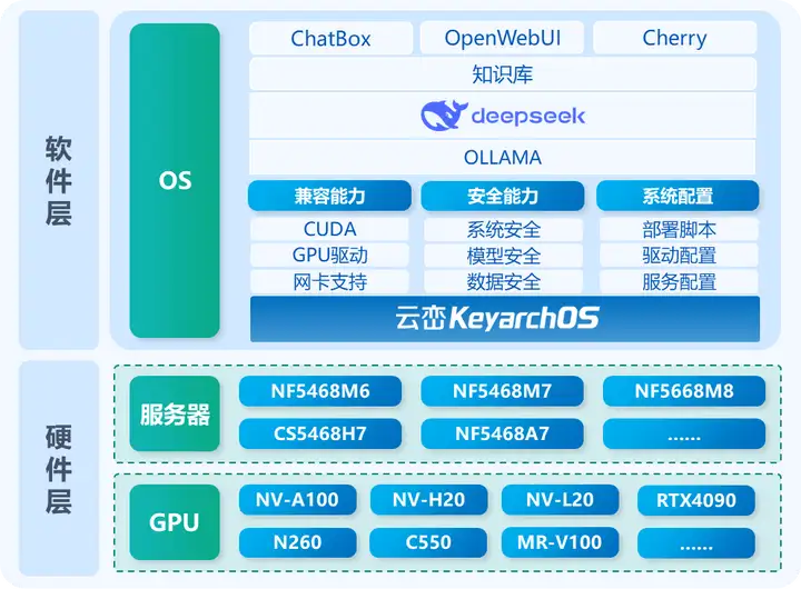 - 服务器及GPU广泛支持:方案选用云峦KeyarchOS作为底层操作系统,天然兼容NF5468G7、NF5468H7等主流AI服务器,并全面支持国内外主流消费级与服务器级GPU,能够支撑DeepSeek在不同计算环境下顺利运行。灵活的硬件兼容性,减少了笔者在部署DeepSeek时的适配成本。