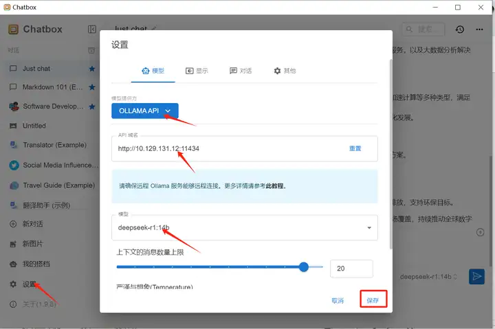 客户端安装Windows版chatbox,打开chatbox进行配置: