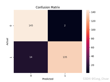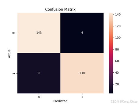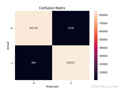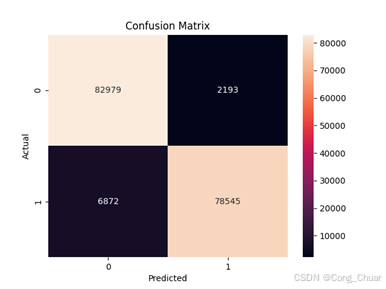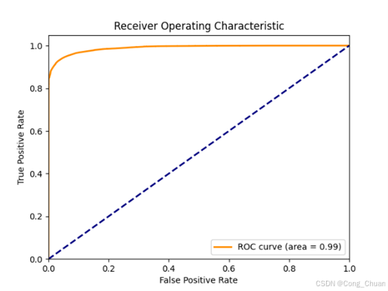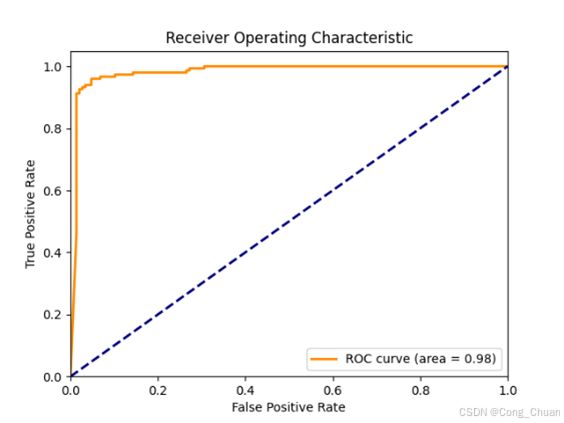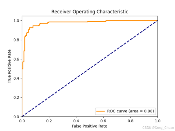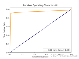 然后,我们使用 GridSearchCV 进行参数调优。GridSearchCV 是一种交叉验证技术,它通过尝试所有可能的参数组合来寻找最佳模型参数。我们使用5折交叉验证,并以roc_auc作为评估指标 (scoring= ‘roc_auc ')。训练完成后,我们输出了最优参数,使用最佳参数重新训练模型并在测试集上进行了预测。