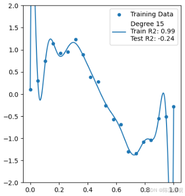 15阶多项式(过拟合):完美拟合训练点(Train R2: 0.99),但在测试集上完全失控!